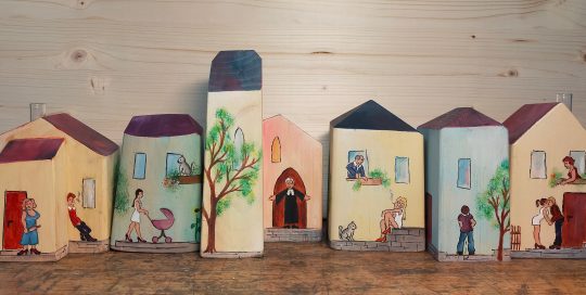 Name des Werkes Häuser mit Miniaturmalerei Beschreibung Häuser aus Holz gesägt und geschliffen mit miniaturmalerei oder zum Selbstbemalen Höhe ca: 10 bis 14 cm